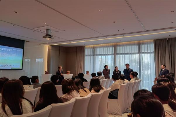 贾经理向同学们详细介绍了万豪酒店企业文化和实习生项目,同样毕业于中国地质大学(武汉)经济管理学院的校友江钏,现任光谷万豪酒店高级销售经理,通过视频分享了自己的从业历程,期待学弟学妹能够从事酒店管理这一充满挑战和乐趣的工作。随后,教学环节开启了光谷万豪酒店中国地质大学(武汉)旅游管理专业“发布会专场”,4位职业经理人现场解答同学们关于酒店管理的各种疑问。