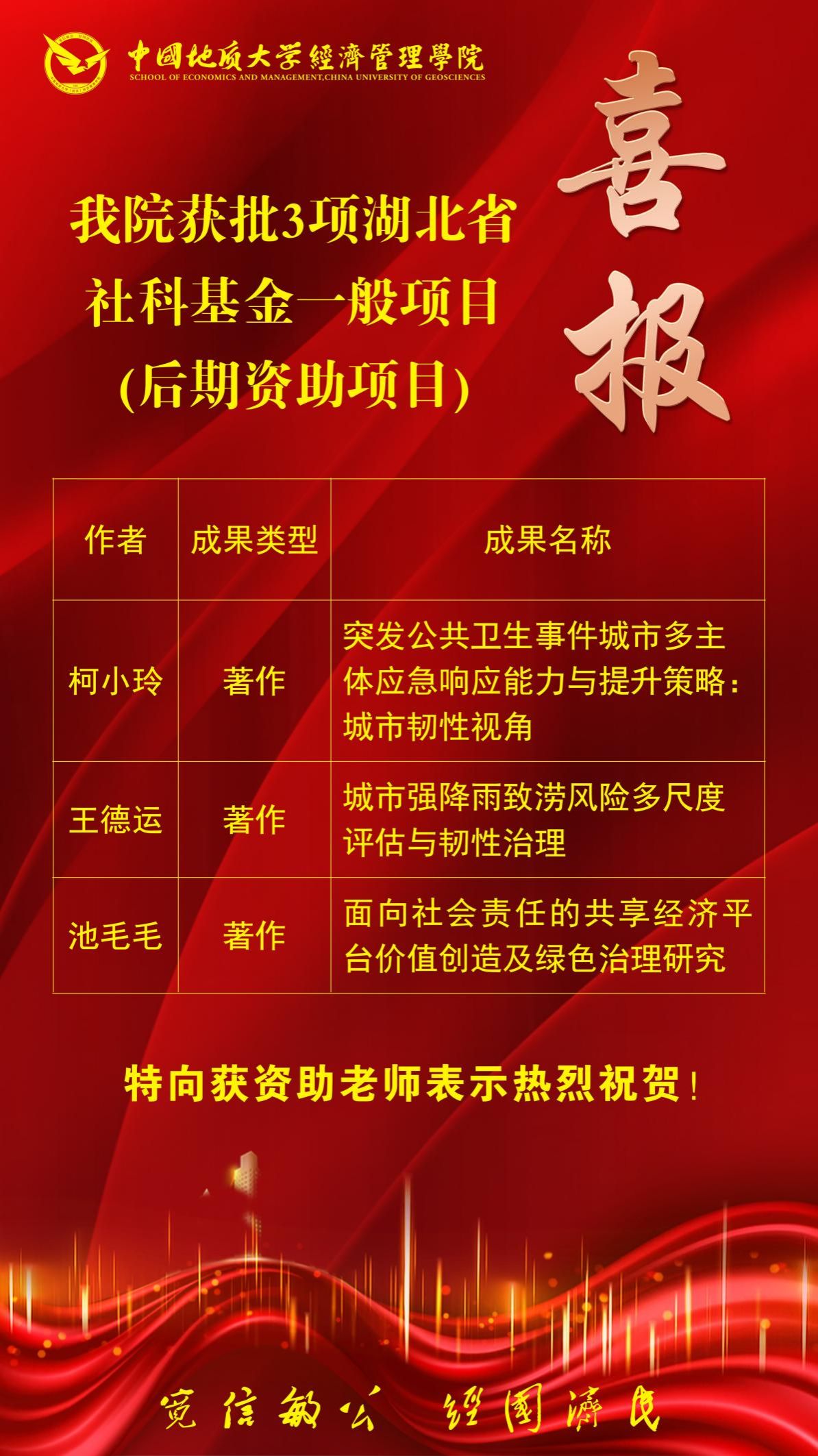 (通讯员 胡松琴)11月14日,2023年度湖北省社科基金一般项目(后期资助项目)拟立项名单公布,经济管理学院柯小玲、王德运、池毛毛三位老师申报的课题项目成功立项,beat365官网科研成果再次喜获丰收。