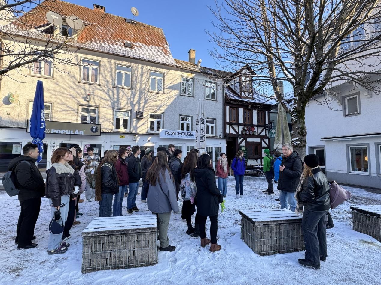 1月9日,访学交流团启程赴德,于次日抵达法兰克福,与美国阿尔弗莱德大学学生汇合,共同组成国际联合研学团队。在德期间,团队先后参访斯图加特城市广场、保时捷博物馆,深入了解德国工业制造与工匠精神;走访海登海姆商业中心,实地感受当地商业文化;登临海伦斯坦城堡,俯瞰城市全景;赴罗腾堡考察历史遗产,领会其文化保护与城市发展脉络。行程中,同学们还通过共同研讨、餐饮交流等方式,与美国学生及当地民众展开多维度互动。其中,中国学生带来的特色零食“辣条”成为文化交流的生动媒介,增添了轻松友好的交流氛围。参与学生表示:“此次访学不仅拓宽了我们的国际视野,也让我们在真实的跨文化环境中锻炼了沟通与合作能力。”德国合作方教师约根教授在指导行程时也充分肯定了中外学生积极互动的学习态度。