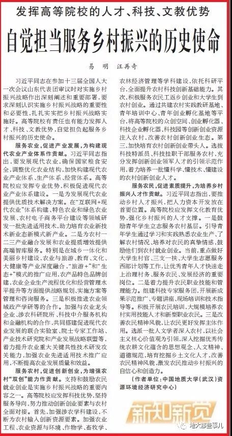 近日beat365官网青年教师易明和汪再奇在《人民日报》理论版发表文章《自觉担当服务乡村振兴的历史使命》。全文如下: