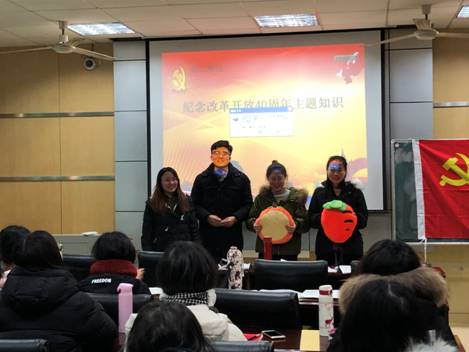 本次活动在集体诵读党章及庄严肃穆的重温入党誓词仪式中拉开序幕。首先,支部组织委员伍青青同志做了充分准备,带领全体党员同志从10个方面回顾了改革开放40年历程及分享了改革开放40年9条宝贵经验。此外,支部任秋颖同志与聂琦露同志因代表支部在“纪念改革开放40周年主题知识竞赛”中获得“三等奖”的好成绩,为提高支部党员同志的积极性,经支委讨论商议,为两位同志颁发奖品。