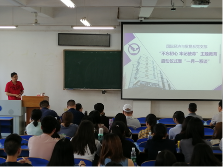 (通讯员:易杏花、安浩楠)9月19日14:30-16:30,经济管理学院国际经济与贸易党支部在南望山校区北区综合楼107成功举行了“不忘初心,牢记使命”主题教育启动仪式暨“一月一系谈”活动。活动由系副主任洪水峰主持,经济管理学院院长杨树旺、副院长肖建忠以及其他所有国际经济与贸易系在校教师出席了活动。