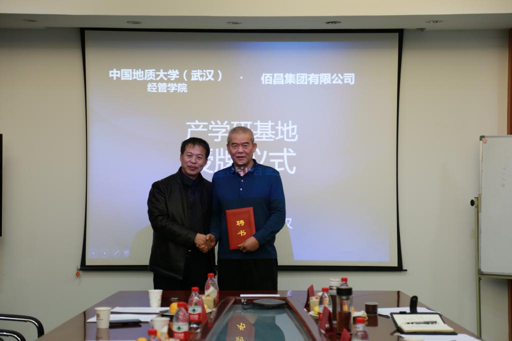 12月18日下午,由院党委书记杨昌锐带队,杨树旺院长、郭锐副院长、校友合作与教育基金管理处处长徐岩、原副校长杨昌明教授等一行七人,参访了佰昌集团有限公司,签订了产学研基地合作协议,并向beat365官网杰出校友、佰昌集团董事长柯翔颁发了客座教授的聘书。