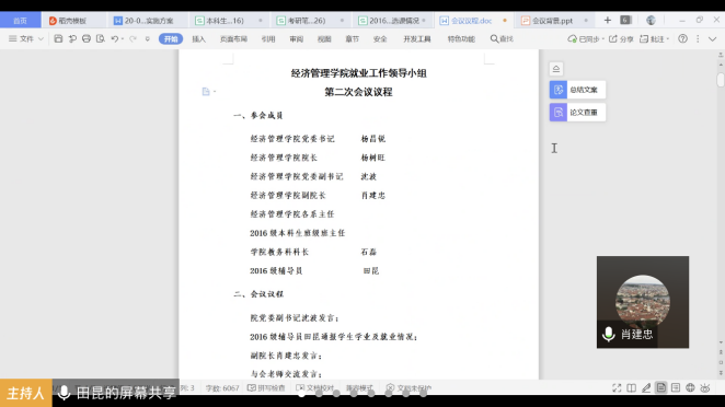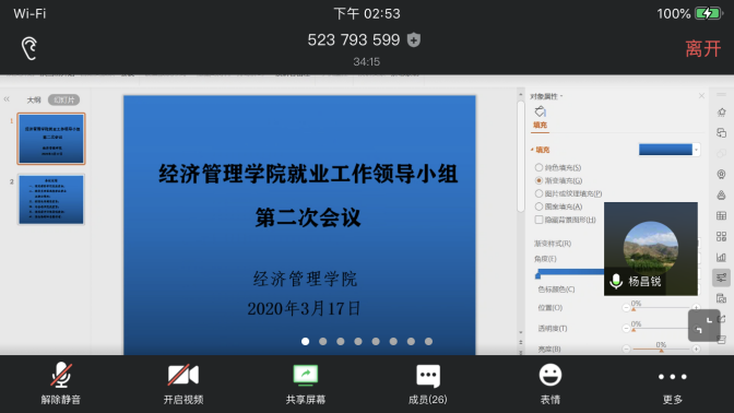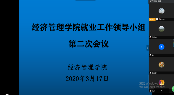 为落实各级各项就业政策,推进《经济管理学院全员促进就业工作实施方案》的实施,促进本届毕业生“顺利毕业、尽快就业”,学院就业工作领导小组于2020年3月17日14:00召开扩大会议,这也是领导小组的第二次线上会议。院党委书记杨昌锐、院长杨树旺、院党委副书记沈波、副院长肖建忠、教务科科长石磊、学院各系主任、2016级本科生班级班主任出席会议,会议由辅导员田昆主持。