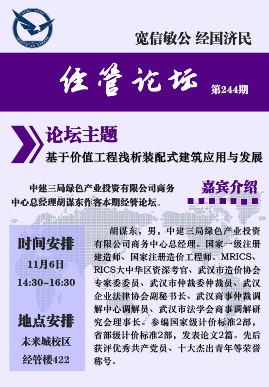 2020年11月6日下午,中建三局绿色产业投资有限公司商务中心胡谋东总经理做客经管论坛,在未来城校区经济管理学院422作了《基于价值工程浅析装配式建筑应用与发展》的报告。王广民、孙涵、翁克瑞、柯小玲、何晨琛、卢辉、彭亚婷等老师及多位博、硕士研究生到场聆听胡谋东总经理的精彩报告。