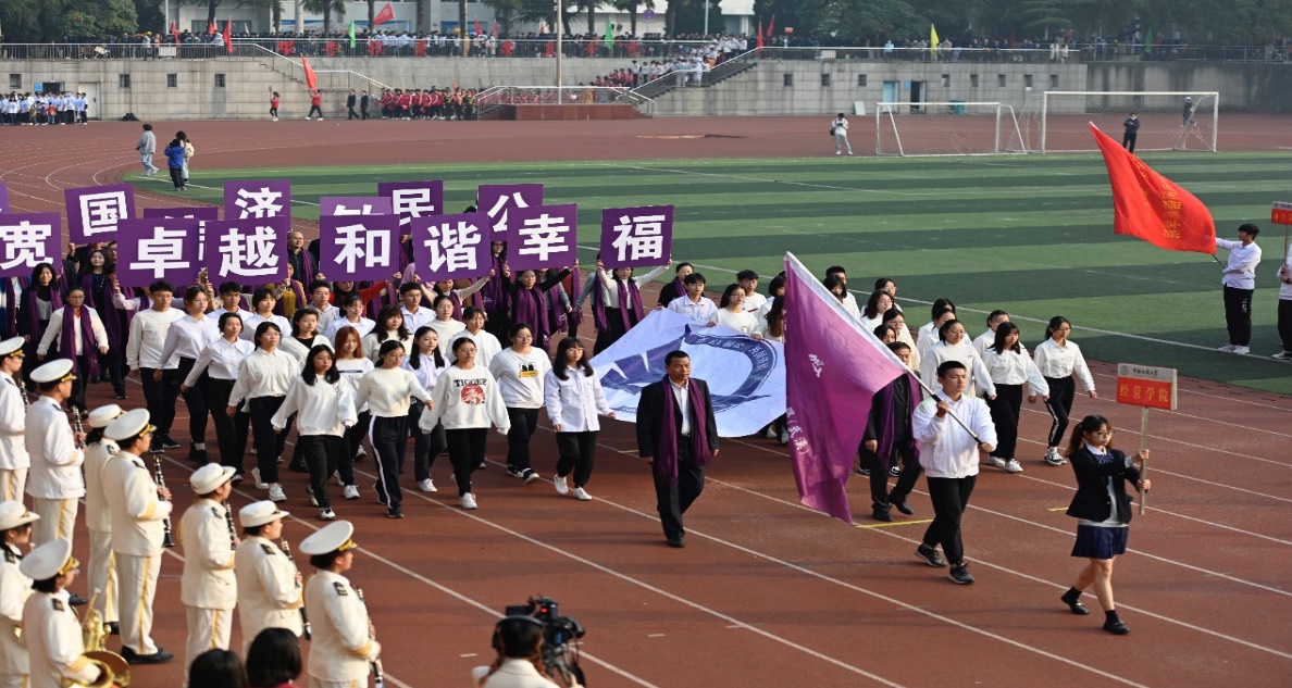 在10月29日的开幕式上,在书记和院长的带领下,由beat365官网师生组成的经济管理学院方阵步伐稳健,昂首阔步走过主席台,亮相全校师生。“卓越、和谐、幸福”的院风,凝聚人心;“宽信敏公,经国济民,地大精鹰,长空万里”的口号,铿锵有力,响彻南望山,展现了经管人的家国情怀。