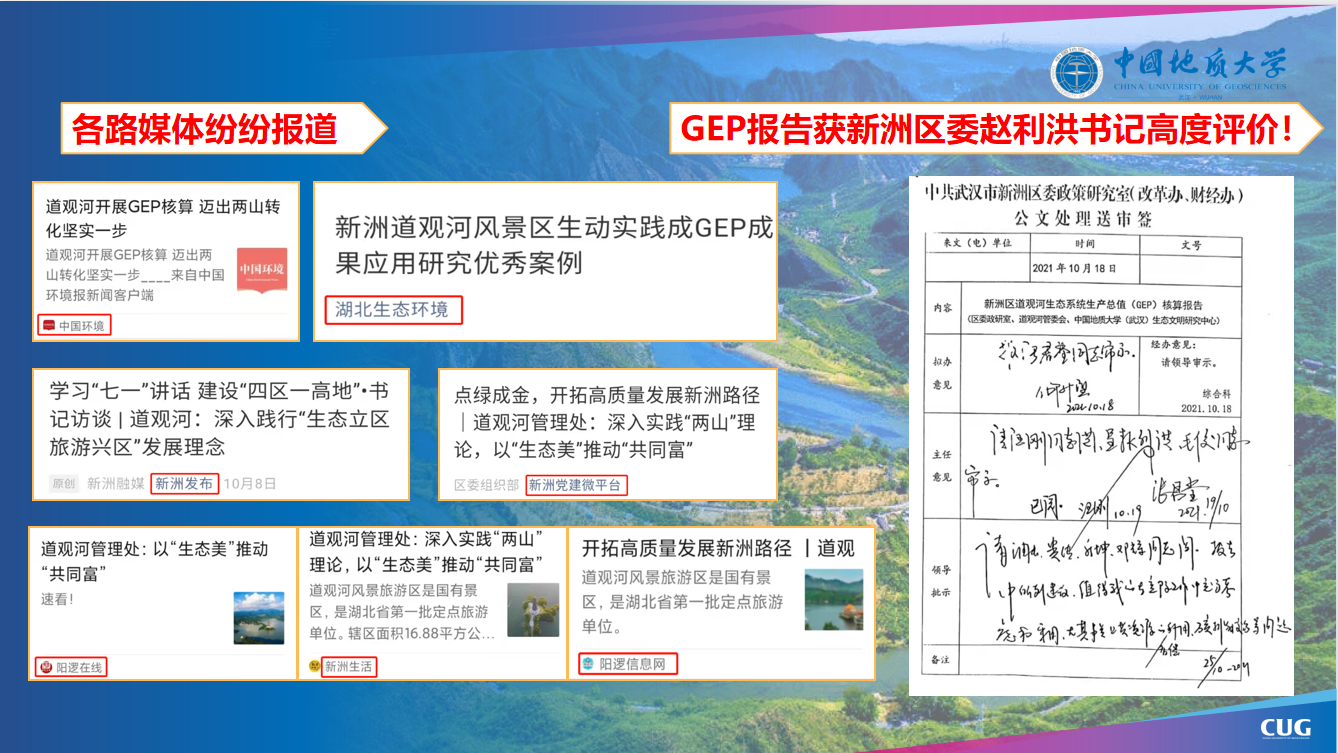 此次道观河GEP核算项目的研究成果,将加速新洲区乃至武汉、湖北全域推进GEP核算工作。目前中国地质大学(武汉)生态文明智库正积极总结GEP核算经验,上报湖北省生态环境厅等部门,中国地质大学(武汉)也将为武汉全力建设国际碳中和示范区、华中绿色金融港,积极争取全国气候投融资试点工作竭尽全力、添砖加瓦,积极为国家生态文明建设贡献智慧和力量。