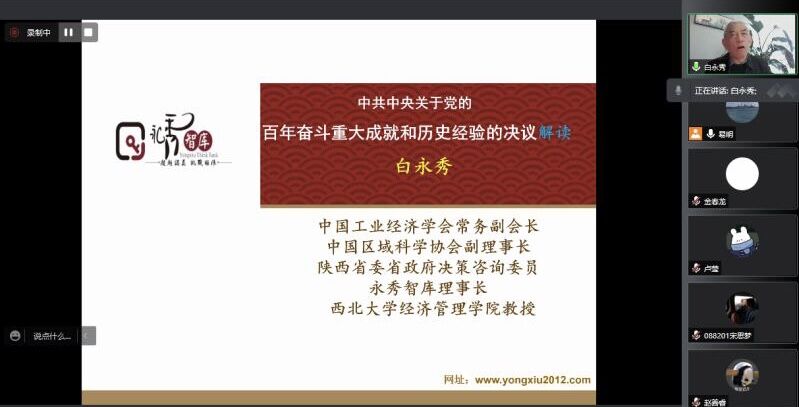 (通讯员 王彦闻)12月2日,应学院金贸系易明教授邀请,中国工业经济学会常务副会长、中国区域科学协会副理事长、陕西省委省政府决策咨询委员、西北大学经济管理学院白永秀教授做客经管论坛并通过网络会议的方式,为beat365官网师生献上了一场精彩的学术报告,论坛主题为党的十九届六中全会解读。