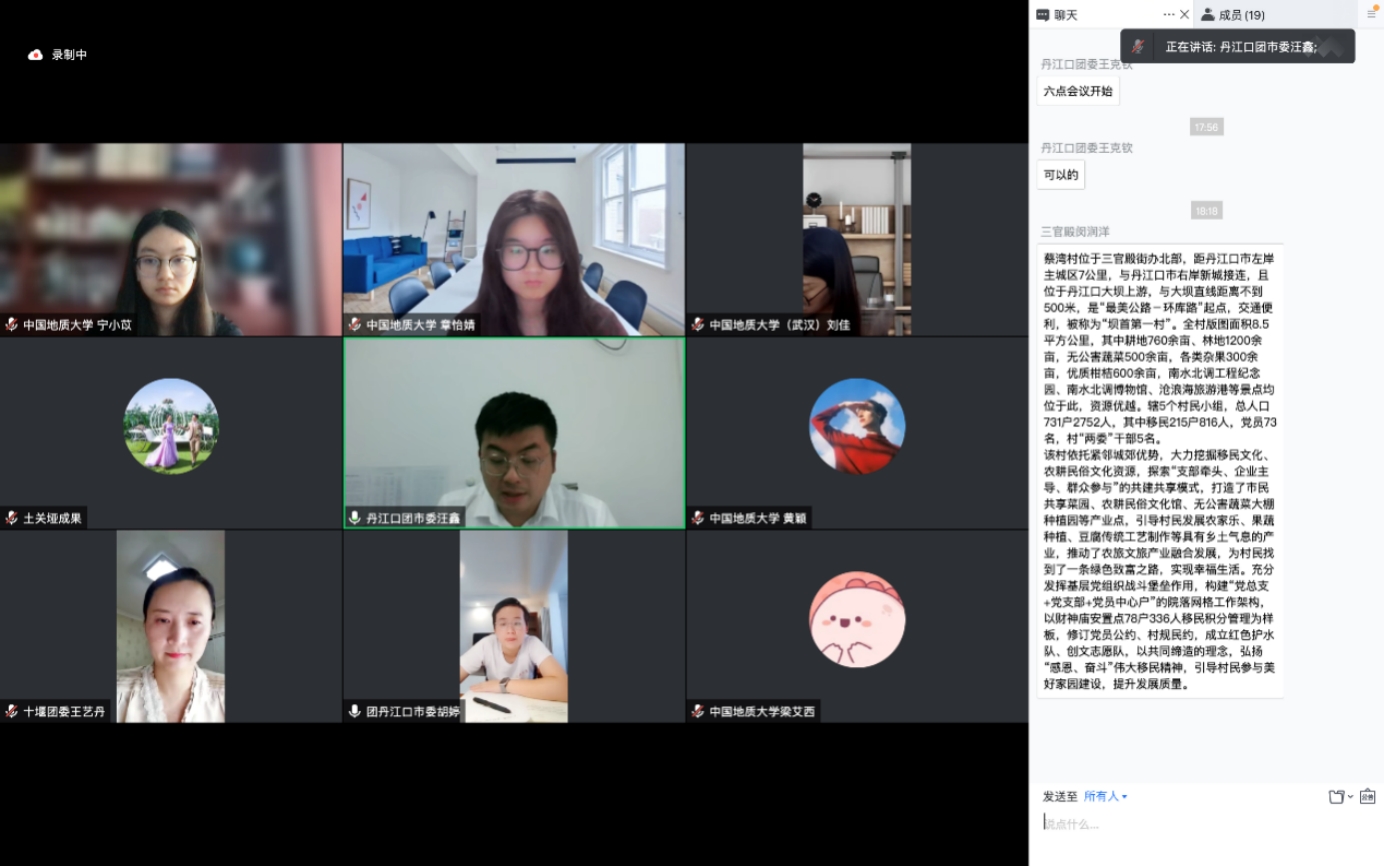 至此,中国地质大学(武汉)“青力缔造”青年实践队十堰分队进驻会圆满结束,此次会议为后期深入丹江口土关垭村、蔡湾村两个服务站点开展“青力缔造”工作奠定了坚实的基础。接下来,待疫情好转,青年实践队将实地考察调研,进一步落实好团湖北省委“青力缔造”工作。