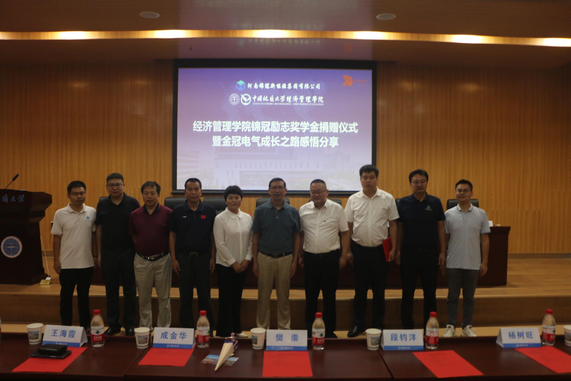 (通讯员 高婧珂)9月9日上午,经济管理学院“锦冠励志奖学金”捐赠仪。会议由学校原校党委副书记、纪委书记成金华教授主持。经济管理学院客座教授、河南锦冠新能源集团有限公司总裁、金冠电气股份有限公司董事长兼总经理樊崇向经管学院捐赠善款并致辞;金冠电气副总裁王海霞、人力资源经理段均洋及经管学院、自动化学院及校友与社会合作处负责同志参加了本次活动。
