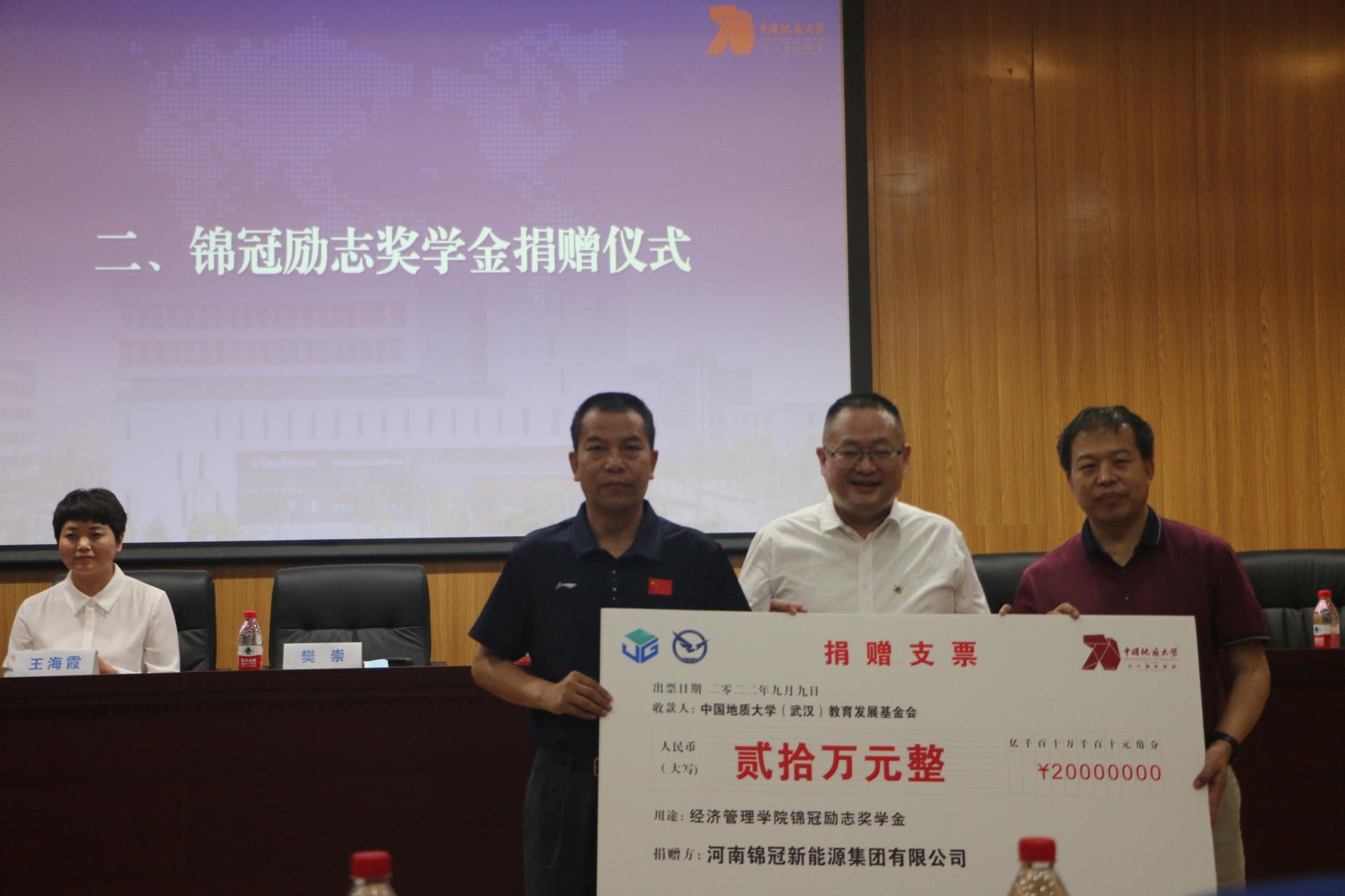 樊崇先生致辞说,百年大计,教育为本,办好教育是全社会共同的责任,需要各界共同参与和支持。此次向中国地质大学(武汉)经济管理学院捐赠20万元设立“锦冠励志奖学金”,是希望能够帮助更多的学生更好地健康成长,更希望获得励志奖学金的同学们能够珍惜学习机会,用优异的成绩回馈社会、报效国家。
