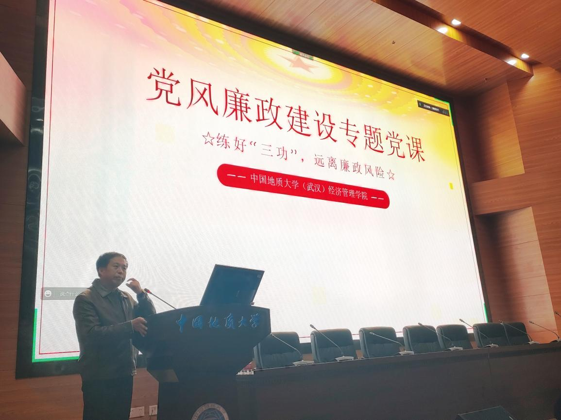 (通讯员:余甫文鑫)为深入推进“清廉学校”“清廉地大”“清廉经管”建设实施方案,落实立德树人根本任务,营造“卓越、和谐、幸福”的院风,推进廉洁教育进课堂,2022年10月14日,经济管理学院党风廉政建设专题党课在经管楼二楼报告厅举行,学院党委书记杨昌锐讲授专题党课,学生党建工作辅导员蔡杨主持。