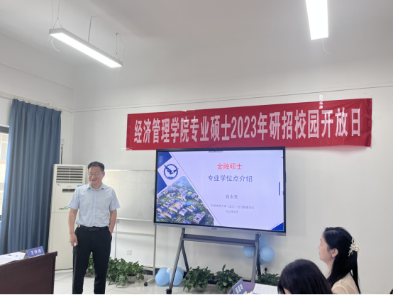 金融与贸易系白永亮老师首先向同学们介绍了金融行业对学科人才的需求,然后详细介绍了我校金融专硕学位点的建设基础与支撑学科、培养目标与学科培养优势与特色方向。他介绍到beat365官网于去年和今年分别承办了2022中国绿色金融学术年会、2023气候投融资国际论坛暨丝路讲坛,为金融学科发展提供交流的平台。
