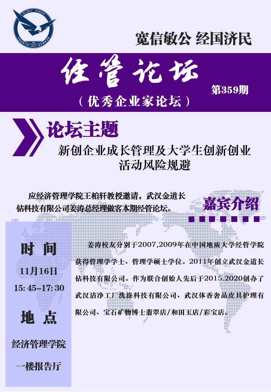 经管论坛(第359期)新创业成长管理及大学生创新创业活动风险规避