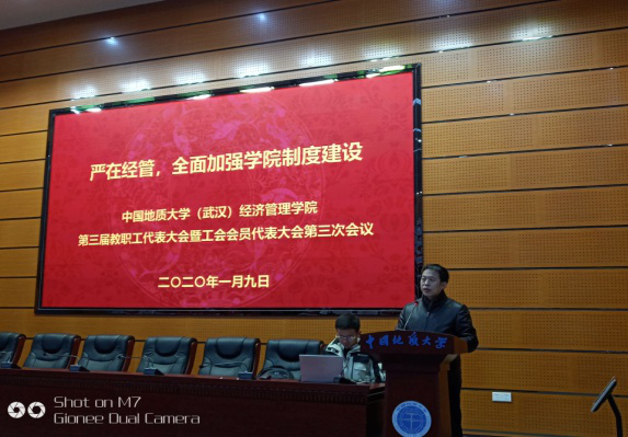 下午,各系主任报告2019年目标责任制实施状况和改进措施,以及交流对学院教学、科研、学科建设、人事等管理制度的建议。经济学系齐睿同志和旅游管理系李江敏同志作专题报告。然后,教职工代表对2019年度工作报告、财务工作报告和工会工作报告进行举手表决,形成大会决议。大会上表彰了学院年度优秀教师,授予邹伟进和刘宇清两位荣休教师“卓越贡献奖”。最后,学院党委书记杨昌锐同志致闭幕词,大会在奏唱国际歌中胜利闭幕。