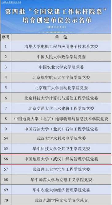 (通讯员 蔡杨)3月18日,教育部公布了第四批新时代高校党建示范创建和质量创优工作遴选结果,遴选产生了10个“全国党建工作示范高校”、100个“全国党建工作标杆院系”、1001个“全国党建工作样板支部”。中国地质大学(武汉)经济管理学院党委成功入选“全国党建工作标杆院系”培育创建单位。