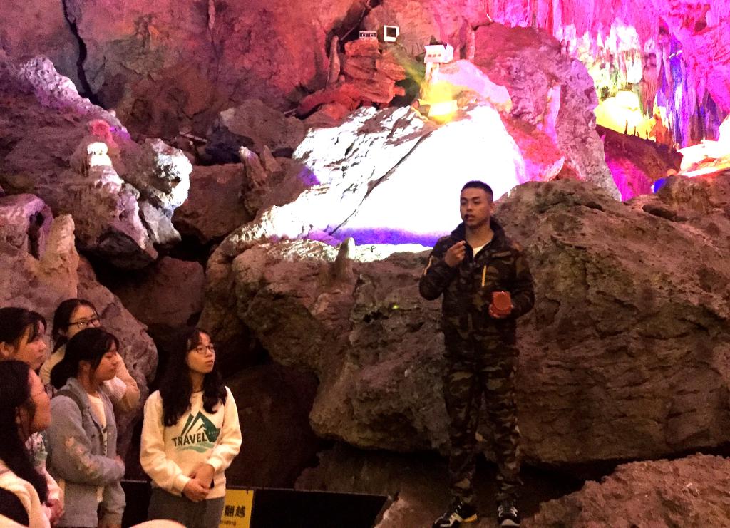 进入洞中,鄢教授详细地向同学们讲述了隐水洞岩溶地貌的形态、类别及成因,并为同学们讲解了隐水洞集地下河泛舟、乘坐小火车和步行为一体的,独一无二的内部游览交通方式。