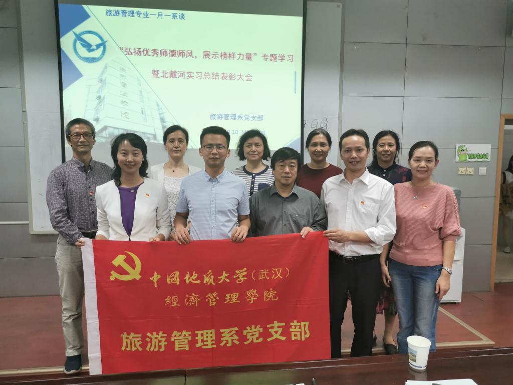 2019.10.10下午,经济管理学院旅游管理系党支部邀请学院学工组,共同组织旅游管理系085181班、经管学院08s197班,以及旅游管理系2019级研究生,在MBA208召开了“弘扬优秀师德师风,展示榜样力量”专题学习暨北戴河实习总结表彰大会。参加本次活动的有经管学工组赵家玮老师,旅游管理系李江敏、肖拥军、李会琴、鄢志武、唐嘉耀、梁玥琳、庄小丽、张俊霞、董淑霞等10位老师。