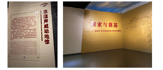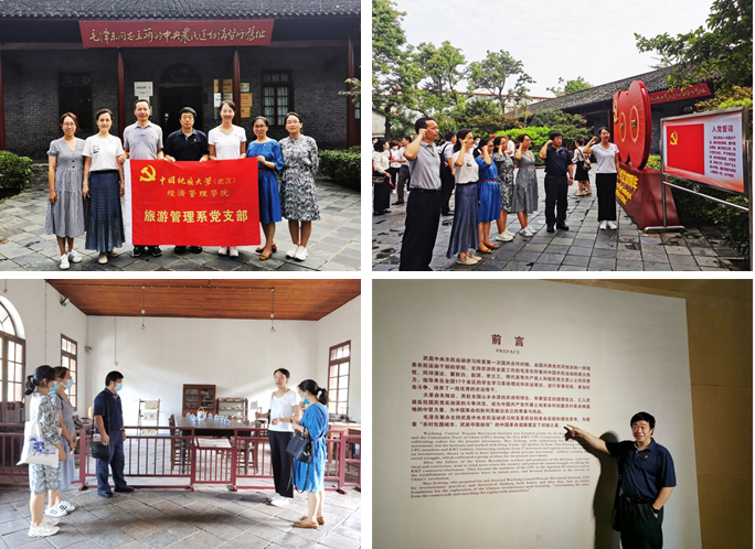 旅游管理系支部党员和群众教师一行首先来到位于武昌区红巷13号的中央农民运动讲习所旧址。在旧址大院内,支部成员先行庄严重温入党誓词,然后在支部书记李江敏的带领下,先参观了依据历史资料复原的办公室、教室、大操场、宿舍、膳堂等办公、学习和生活场所,再至历史博物馆内深入学习了解农民运动讲习所的历史及其对中国革命的影响。期间,李江敏同志和鄢志武同志为大家的学习参观进行讲解。
