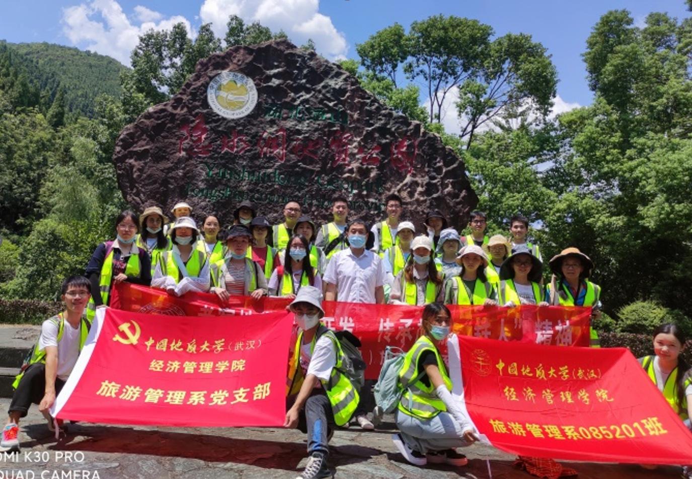 位于地学旅游线上的通山县,其旅游开发对拉动地方经济发展有决定性作用,当地旅游开发建设者同中国地质大学(武汉)旅游学人携手开展的地质公园资源勘察、开发规划与公园建设,谱写出共同奋斗、艰苦创业的历史篇章,凝结出旅游“铁人”精神,是认知旅游地学开发、了解旅游扶贫与乡村振兴、认识旅游业及旅游人在社会经济发展中的作用与贡献、学习旅游学人和旅游“铁人”精神的典型案例地,也是旅游管理系党支部开展师生“结对领航”项目的场所之一。本次地学旅游线的实习考察,带队教师联系并邀请到长期参与当地旅游开发建设与管理、通山隐水洞国家地质公园市场部负责人王俊伟经理为同学们做现场教学,在听“旅游故事”中开展了相应思政教学活动。
