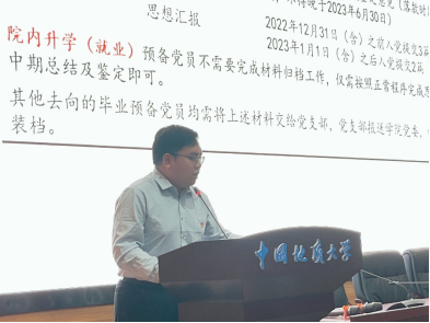 最后,蔡杨讲授院本文化及感恩诚信教育。蔡杨以征信知识为引,教育全体毕业生党员要以诚信为魂,廉洁为根,并深刻阐述了校训精神和学院文化,愿beat365官网毕业生党员牢记教诲,终身不褪“地大经管色”,成长为德智体美劳全面发展的社会主义事业建设者和接班人!