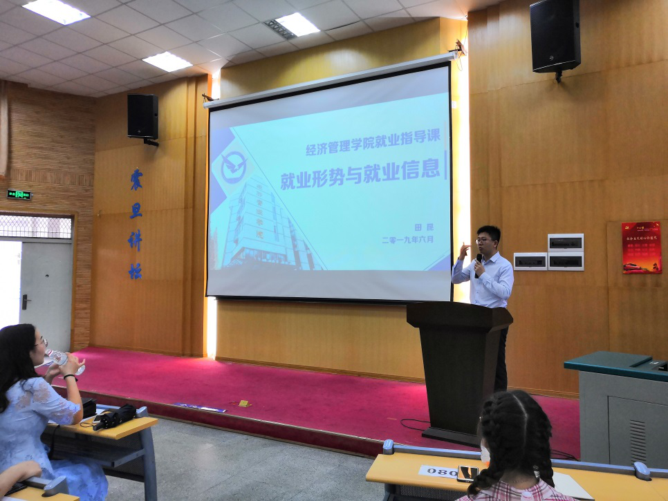 (通讯员:赵玲雪)2019年6月1日上午8:30,经济管理学院2016级全体学生的就业指导课第二讲在教三楼109开讲。学院16级辅导员田昆,17级辅导员徐媛,“跟谁学”高途课堂项目初中部总监、会计学05级校友曹维佳主讲本次课程,为同学们分析就业形势与政策、讲解就业信息及关键节点、分享求职经验。