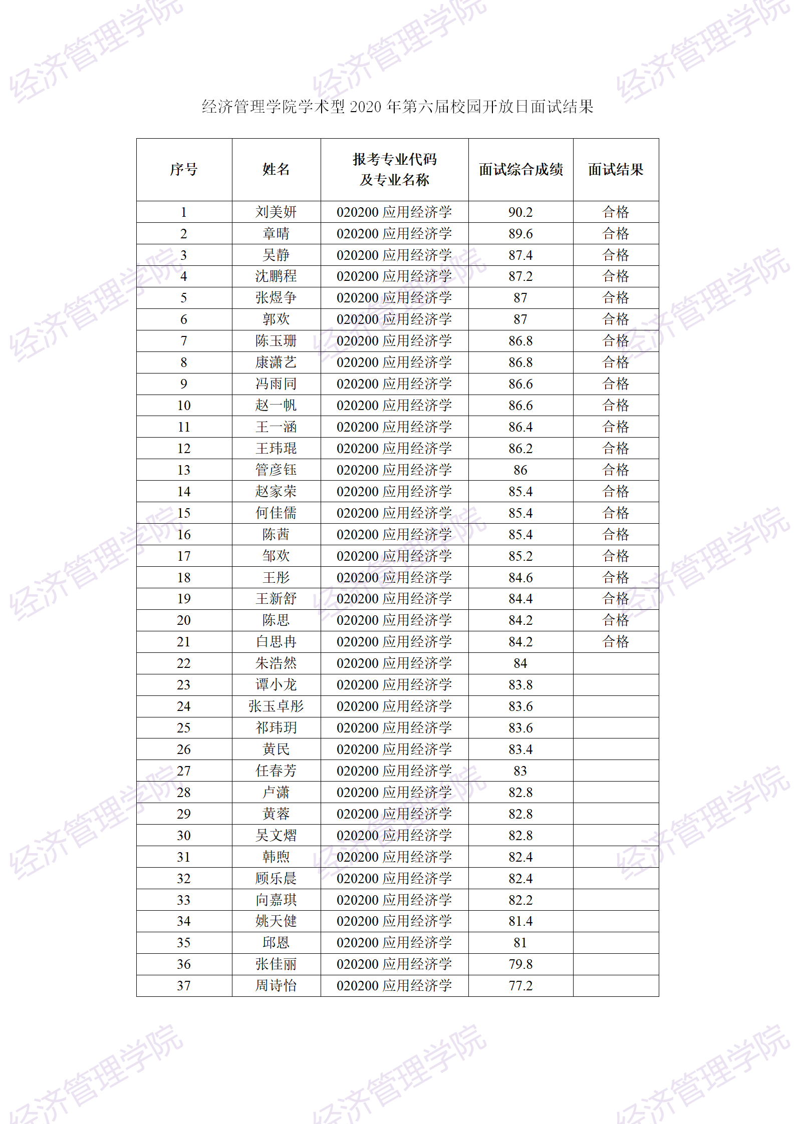 经济管理学院学术型2020年第六届校园开放日面试结果(见附件)现进行公示。公示起止时间为2020年7月17日至7月30日止。公示期内若有异议,请实名书面申诉(限工作日)。联系人:王老师,Email:360655881@qq.com。
